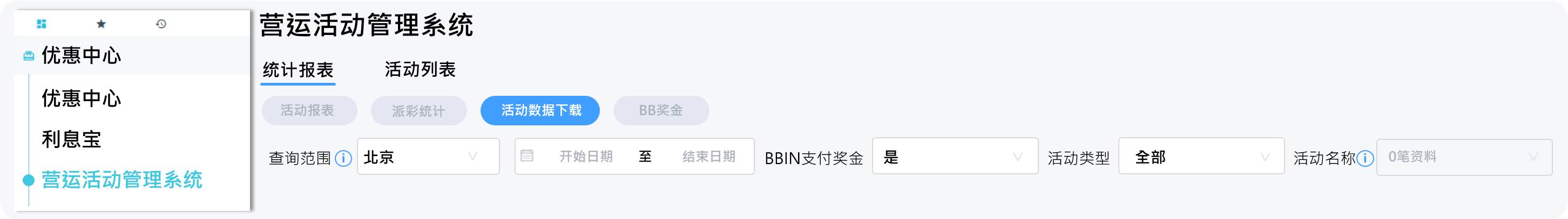 管端路径:优惠中心→营运活动管理系统→活动数据下载→选择活动时间区间→活动名称
